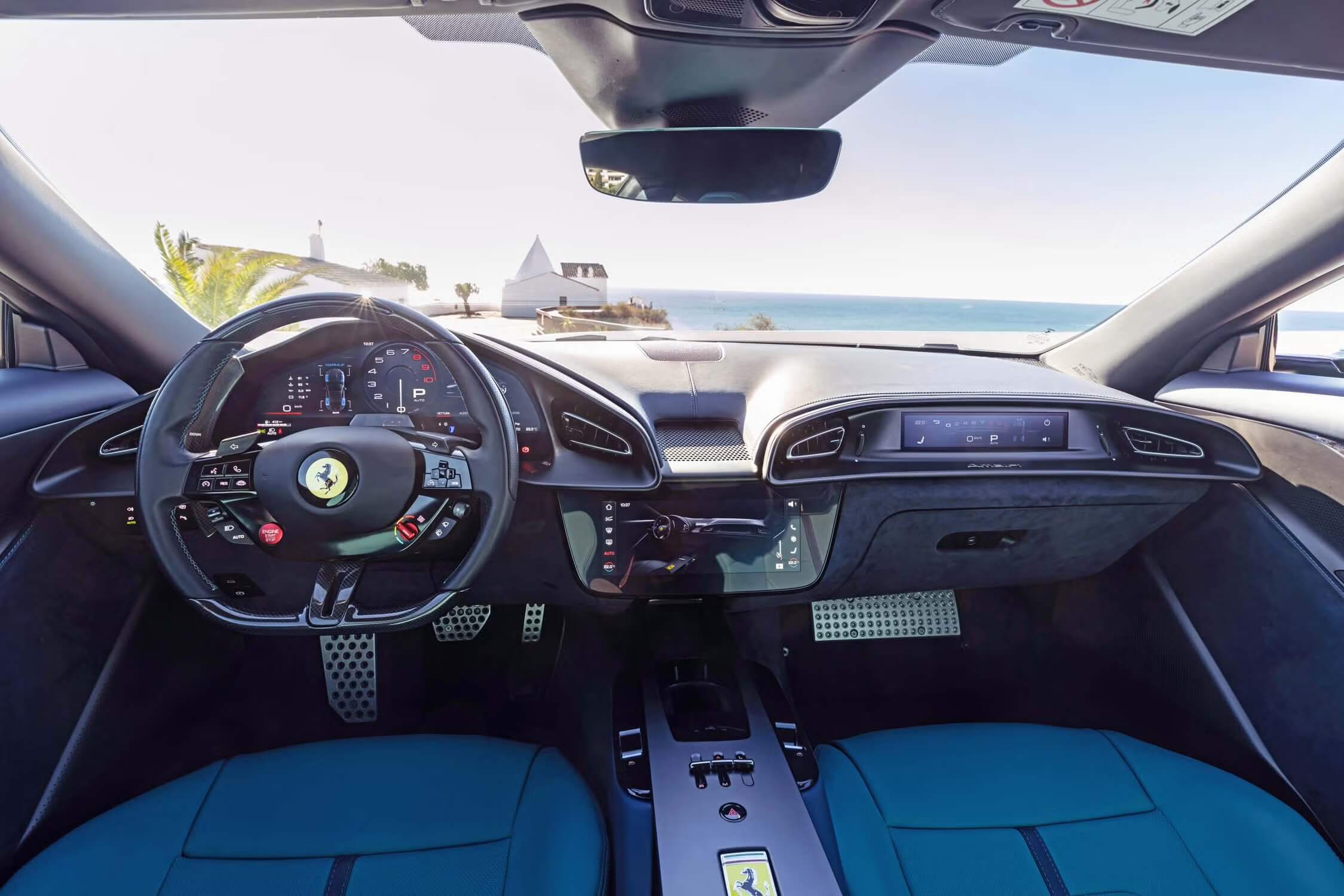 ويبرز هذا التطور بشكل واضح في نظام التوجيه. فقد اعتمدت فيراري عجلة قيادة أنحف من المعتاد، مكسوة بجلد فاخر، في ابتعاد واضح عن العجلات السميكة التي أصبحت شائعة في السيارات الرياضية الحديثة. والأهم من ذلك هو عودة الأزرار الفيزيائية إلى عجلة القيادة، بما في ذلك زر تشغيل المحرك ومفتاح اختيار أنماط القيادة، ما يعزز سهولة الاستخدام ويتيح للسائق إجراء التعديلات دون تشتيت انتباهه عن الطريق.
