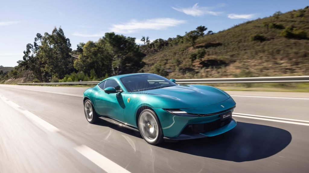 وفي المقصورة، أعادت فيراري تصميم البيئة الداخلية لتصبح أكثر ترحيباً واتساعاً. فقد جرى اعتماد شاشة مركزية بقياس 10.3 بوصات بوضعية أفقية ومنخفضة في لوحة القيادة، ما يعزز الرؤية الخارجية ويبرز جودة المواد المستخدمة. كما أُعيد تصميم الكونسول الوسطي ليكون أكثر انخفاضاً مقارنة بروما، ما يضفي إحساساً بالرحابة، مع لمسات من الألمنيوم الأنيق.
