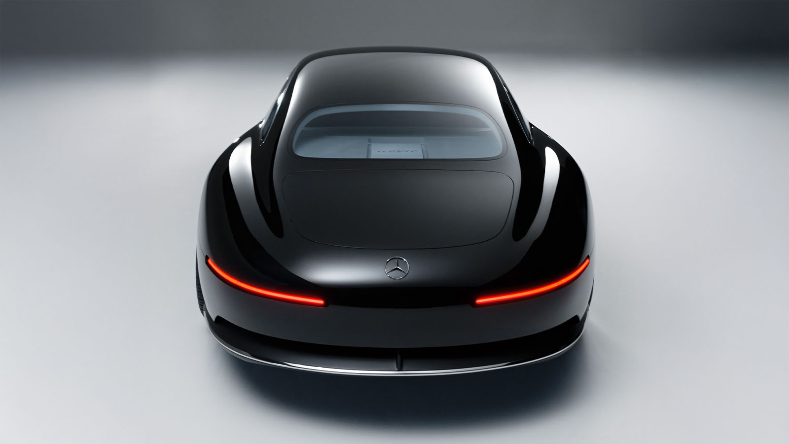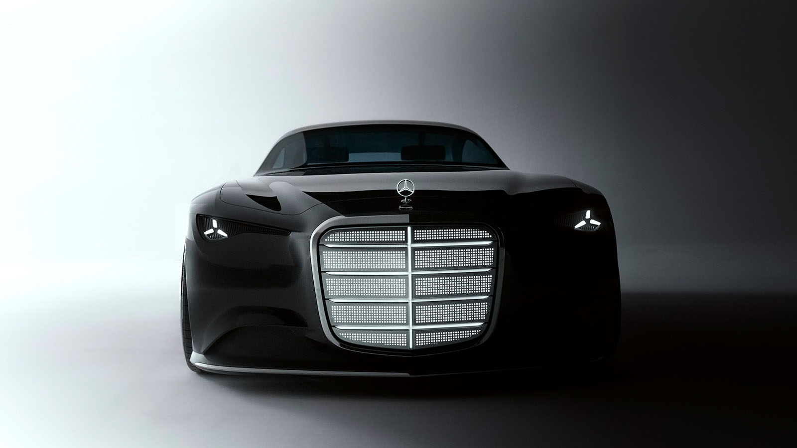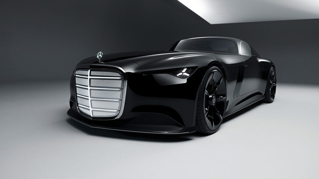 من الخارج، التصميم ببساطة آسر. غطاء المحرك طويل بشكل استثنائي يمتد للأمام كعمل نحتي متحرك، فيما تنحني المقصورة بانسيابية أنيقة نحو الخلف. المقدمة عمودية وجريئة، تهيمن عليها شبكة تهوية مستوحاة من التصميم الكلاسيكي لمرسيدس، لكنها هنا تتحول إلى لوحة رقمية مضيئة مؤلفة من مئات المربعات الصغيرة المتوهجة. وفوقها يتلألأ شعار النجمة الثلاثية الذي يضيء بفخر، في حين تأتي المصابيح الأمامية بتصميم يعكس شكل هذا الشعار نفسه — وهي لمسة تصميمية بدأت تظهر بالفعل في طرازات الإنتاج الحديثة.